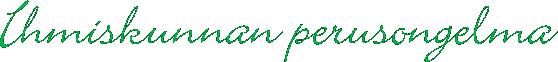 Ihmiskunnan perusongelma kuulostaa varmaankin – suurelta asialta. Onhan se: kyseinen käsite sulkee sisäänsä aivan kaiken ihmisiin liittyvän, niin ongelmat kuin ongelmattomuudetkin. Suurten asioiden äärellä alkaa helposti tuntea itsensä voimattomaksi ja mitättömäksi. Ihmiskunnan perusongelman edessä ei kuitenkaan kannata heittäytyä pelokkaaksi eikä lannistuneeksi, sillä meidän elämäämme se ”vain” käsittelee. Voin myös lohduttaa toteamalla rehellisesti, ettei perusongelma ole mitenkään monimutkainen. Samaan hengenvetoon on silti myönnettävä, että yksinkertaisuuden näkemiseksi on kahlattava monen monia pieniä ja suuria yksityiskohtia, joista muodostuu melko monimutkainen verkosto, joka pitäisi saada näkymään yhtenäisenä kirkkaana kuvana. Mitä enemmän pöydälle tipahtelee puuttuvia palapelin osia, sitä helpommin kokonaiskuva alkaa hahmottua, kuin itsestään. Kun kaikki palat loksahtavat kohdalleen, voimme hihkaista ”valmis!” ja todeta muutamalla sanalla mitä palapelin kuva esittää.
