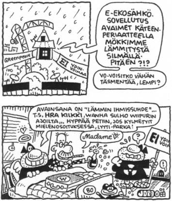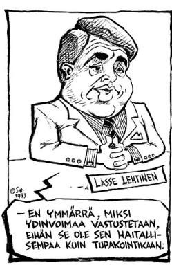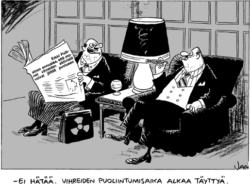Piirros 12. Ydinvoiman turvallisuuskysymysten lailla Lasse Lehtinen ja Seppo Leinonen ovat kuuluneet osana suomalaiseen ydinvoimakeskusteluun jo vuosikymmenten ajan.[49] Piirros kuvaa myös toisella tavoin ydinvoimakeskustelulle tyypillistä piirrettä. Siinä ydinvoiman haittoja verrataan tupakoinnin haittoihin. Vertaaminen oli oleellista kannattajien argumenteissa myös vuonna 2002. Heille uhkien argumentointi tarkoitti yhtäältä ydinvoiman riskien kieltämistä, toisaalta osittaista myöntämistä. Erittäin keskeistä oli ydinvoiman riskien vertaaminen erilaisiin ”suurempiin pahoihin”, ensisijaisesti ilmastonmuutokseen, toissijaisesti hiileen ja maakaasuun, kolmanneksi uusiutuvien ja säästön kalleuteen. Tästä vertailusta juontui, että johtopäätöksenään kannattajat näkivät ydinvoiman ainoana vaihtoehtona. Tällöin minkä tahansa muun energiantuotantovaihtoehdon valitseminen johtaisi kannattajien mukaan ilmastonmuutokseen ja ympäristötuhoon: skenaarioista irrottautuminen mahdollisti uhka-asetelman ”ydinvoima vai hiili”, kuten luvussa 2.1 havaittiin. Vastaavalla irrottautumisella kannattajat esittivät toiseksi valintatilanteeksi ”ydinvoima vai maakaasu”, jossa maakaasu liittyi yhteen ilmastonmuutoksen kanssa maakaasun fossiilisen luonteen perusteella. Uusiutuvien ja energiansäästön tapauksessa ympäristötuhon sijasta seuraisi taloudellinen tuho. Tämän lisäksi kannattajat puolustivat ydinjätettä kolmannella valinta-argumentilla ”ydinjäte vai pienhiukkaset”, jota käsittelin aiemmin tässä alaluvussa. Kaikissa vertauspareissa kannattajat näkivät ydinvoiman ja ydinjätteet pienimpänä pahana. Vastustajien mukaan ilmastonmuutos oli kyllä suuri paha, mutta ydinvoima ei ollut sen parempi. Vastustajien mielestä maakaasu oli pienin paha, kun paras vaihtoehto olisivat uusiutuvat ja säästö. Vastustajat pyrkivätkin asettamaan ympäristövertailussa vastakkain ydinvoiman ja uusiutuvat,[50] mitä asettelua kannattajat taas välttivät. Vastustajat myös muistuttivat toistuvasti, että ydinvoima oli KTM:n skenaarioissa sidottu hiilivoiman pitkitettyyn käyttöön eli ilmastonmuutokseen ja pienhiukkasiin. Näin vastustajat pyrkivät palauttamaan keskustelun skenaarioihin, joista kannattajat olivat sen irrottaneet. Skenaarioiden ulkopuolelle vastustajat taas kurkottivat tuomalla keskusteluun liikenteen sekä hiukkas- että kasvihuonekaasupäästöt ja rakentamisratkaisujen vaikutukset päästömääriin. Lisäksi vastustajat avasivat keskustelua skenaarioiden ulkopuolelle kuvaten ydinvoimaa mm. Kioton pöytäkirjan, Rion julistuksen ja Agenda 21:n nojalla ekologisesti kestämättömäksi missä tilanteessa tahansa eli riippumatta siitä, sidottaisiinko se hiilivoiman jatkokäyttöön tai uusiutuviin ja säästöön vai ei[51].
