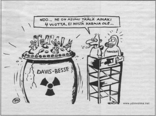 Kannattajat myös korostivat, että Tshernobylin onnettomuus tapahtui itävoimalassa eikä vastaava olisi mahdollista länsivoimalassa. [31] Vastustajat vastasivat tuomalla keskustelussa julki länsimaissa vastikään tapahtuneita ydinonnettomuuksia ja läheltä piti -tilanteita, kuten Davis-Bessen tapauksen (piirros 8).