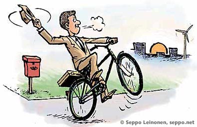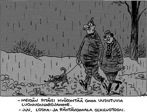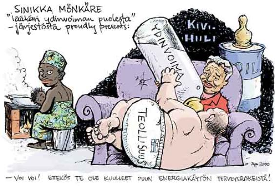 Piirros 13. ”Huomenta, tuuli!”[53] Skenaarioiden asettamat rautakehykset kuitenkin pitivät eikä laajaan yhteiskunnalliseen keskusteluun yhteiskunnan suunnasta ja ilmastonmuutoksen torjumisesta ryhdytty. Tämä on toisaalta ymmärrettävää, koska kyse oli nimenomaan ydinvoimalahakemuksen käsittelystä ja ilmastostrategia oli käsitelty erikseen edellisenä vuonna. Toisaalta ilmastostrategian painottuminen sähköntuotantoratkaisuihin jätti keskusteluun mielikuvan, ettei yhteiskunnan muilla osa-alueilla tarvitsisi tehdä paljoa ilmastonmuutoksen torjumiseksi. Vähäinen kiinnostus laajempaan päästövähennyskeskusteluun saattoi siis johtua samantyyppisistä syistä kuin ydinjätekeskustelun laimeus: ongelma katsottiin jo ratkaistuksi. Etenkin kannattajien argumentoinnissa oli vahvasti läsnä ajatus, että valitsemalla ydinvoima sähköntuotannossakaan ei tarvitsisi tehdä suuria muutoksia. Siten ydinvoimala pelastaisi sekä ilmastonmuutokselta että yhteiskunnalliselta muutokselta, jonka taas ydinvoiman vastustajat näkivät ympäristöongelmien ainoana kestävänä ratkaisuna. Luvussa kolme tämä vastakkainasettelu ja johtopäätös vahvistuvat talouden ja hyvinvoinnin näkökulmasta: kannattajat halusivat ydinvoimaa talouden uhkilta pelastajaksi ja vallitsevien olojen säilyttäjäksi, kun taas vastustajat katsoivat talouden ja yhteiskunnan muutoksen jälkiteolliseen suuntaan olevan ainoa keino säästyä uhkilta. Mielestäni Verkkouutisten päätoimittajan kommentti luonnehtii osuvasti sekä kannattajien lähtökohtaista muutosvastaisuutta että vastustajien lähtökohtaista muutosinnokkuutta: