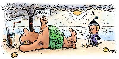 Lainaus tiivistää kannattajien keskeisimmän argumenttiketjun. Kannattajien ympäristöargumentit eivät kuitenkaan olleet staattisia, vaan muuttuivat keskustelun kuluessa etenkin hiilivoiman osalta. Eduskunnan lähetekeskustelussa helmikuussa mm. ministeri Mönkäre argumentoi, että myönteinen ydinvoimaratkaisu on tarpeen, jotta ”kaikkein järeimpiä ja ikävimpiä keinoja” hiilivoiman alas ajamiseksi ei tarvitsisi ottaa käyttöön vielä lähivuosina eikä energiaveroja olisi tarpeen korottaa yhtä paljon kuin ilmastostrategian ydinvoimattomassa KIO1-skenaariossa. Ydinvoimallisessa KIO2-skenaariossa hiilivoimaa käytetäänkin pidempään kuin KIO1:ssä. SAK halusi käyttää hiilivoimaloita tätäkin pidempään: niiden normaalin käyttöiän loppuun saakka.[4] Argumentit saivat murskavastaanoton ydinvoiman vastustajilta, jotka olivat useiden vuosien ajan moittineet etenkin teollisuutta mutta myös hallitusta ja ministeriöitä vastuuttomuudesta ilmastonmuutoksen torjunnassa. Esimerkiksi Kioton pöytäkirjan syntyvuonna 1997 piirros 1 piikitteli teollisuutta.